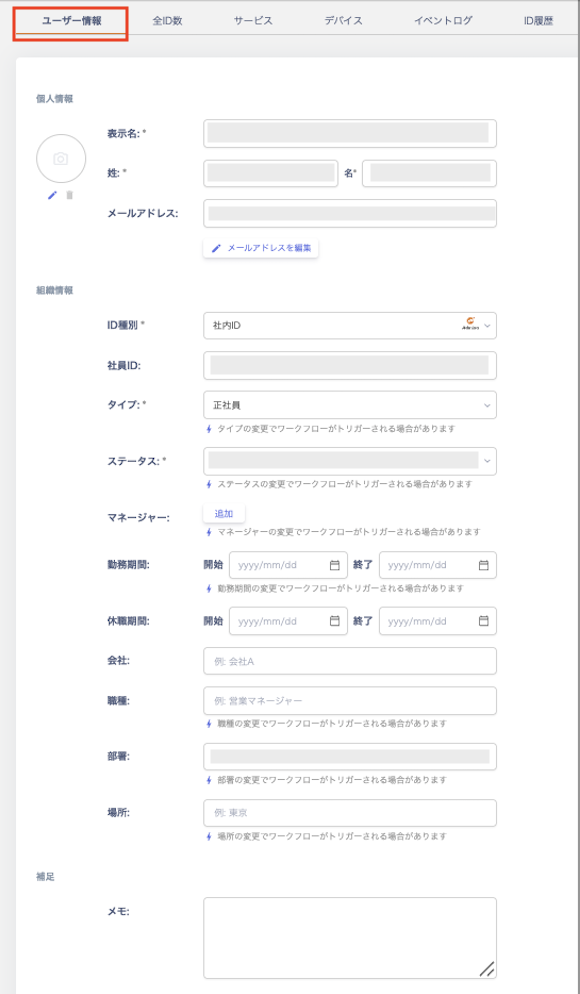 タイプ(必須) | 正社員、従業員などを選択します。メールアドレスのドメインにより、選択可能な項目が決まっています。 詳細は後述のタイプをご覧ください。 |