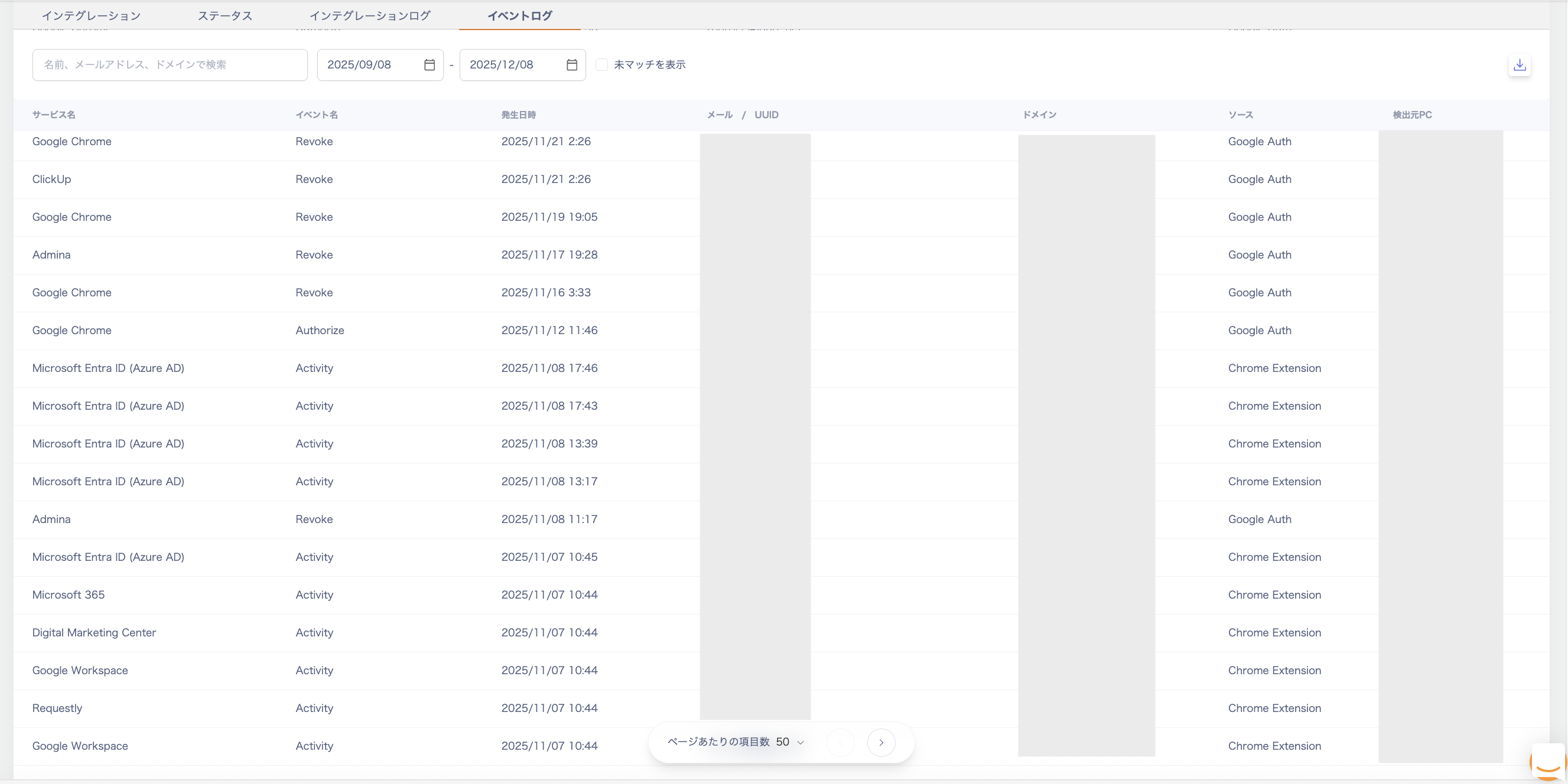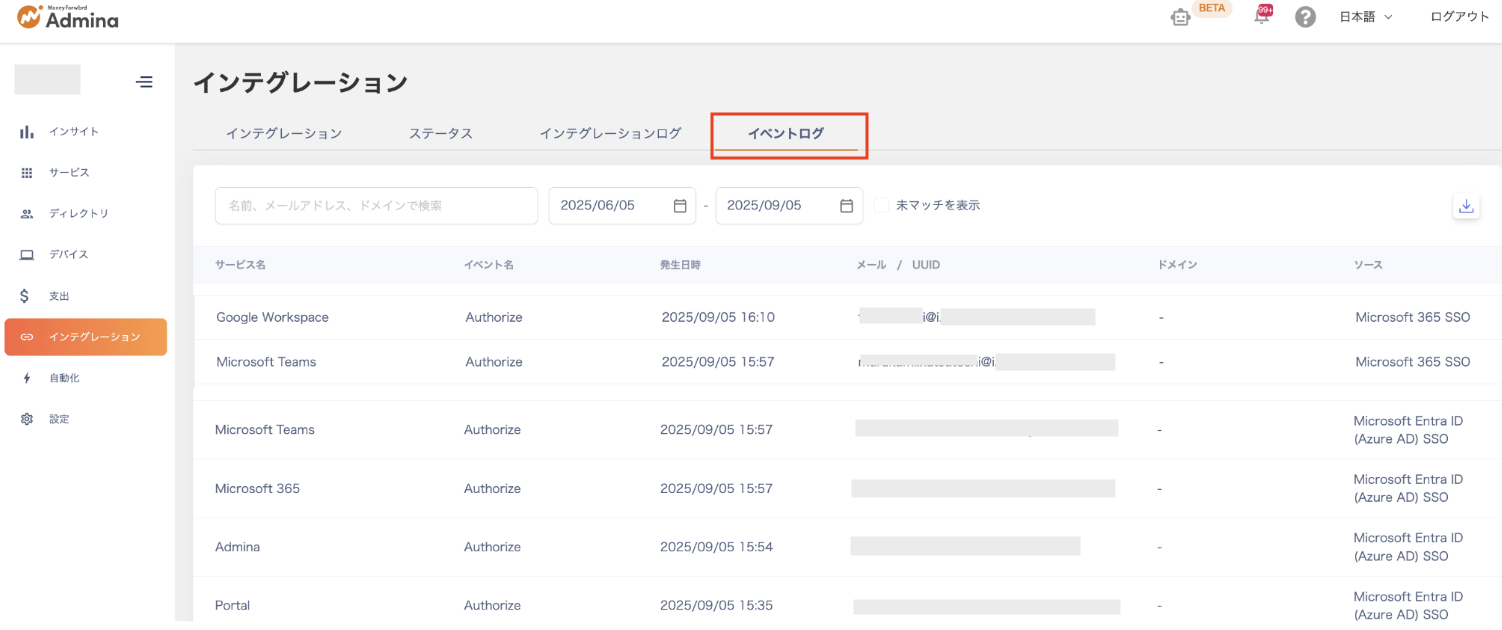 インテグレーション > イベントログで確認します。サービス名やメールアドレスでのフィルタが可能です。