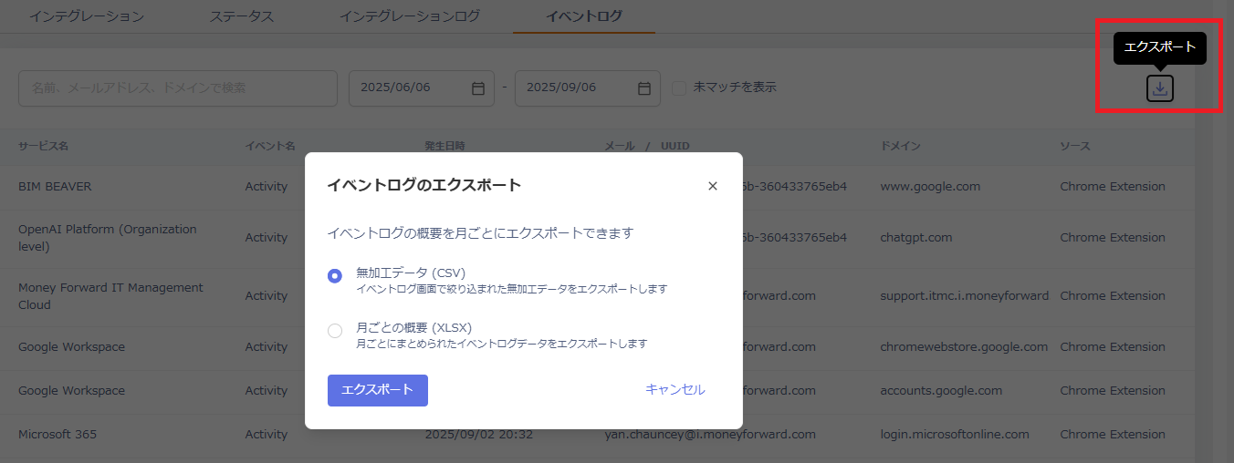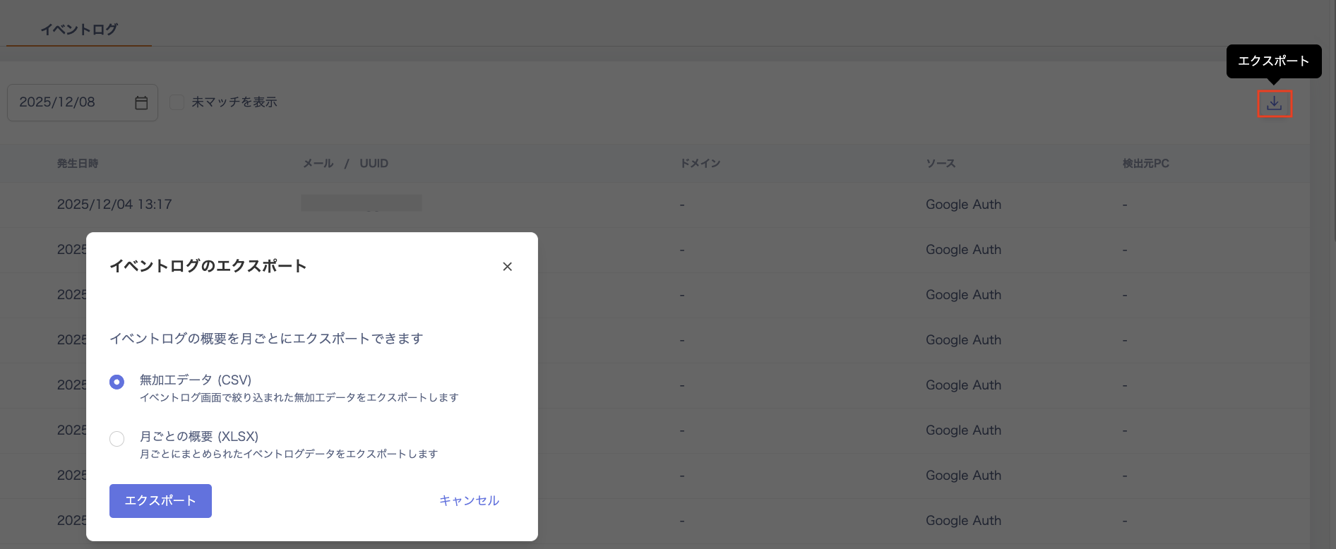 イベントログページでフィルタしたデータをCSVファイルに出力します。エクスポートされる内容はUIで表示される内容と同様です。