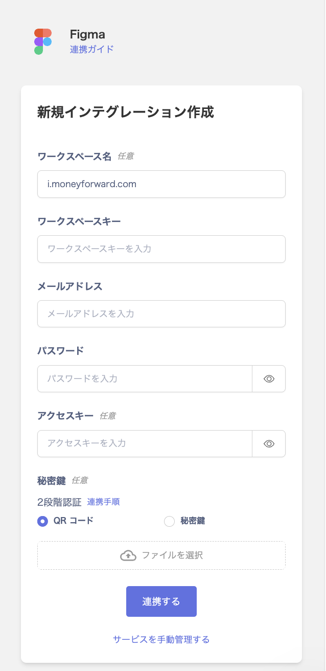 - ワークスペース名には任意の名称(会社名など)、前の手順で取得したワークスペースキー、管理者権限のメールアドレス・パスワードを入力し、連携するをクリックします。*Google認証やSSOでログインしたユーザではパスワードがないため、認証エラーとなります。Figmaで作成したアカウントのメールアドレス、パスワードをご利用ください。