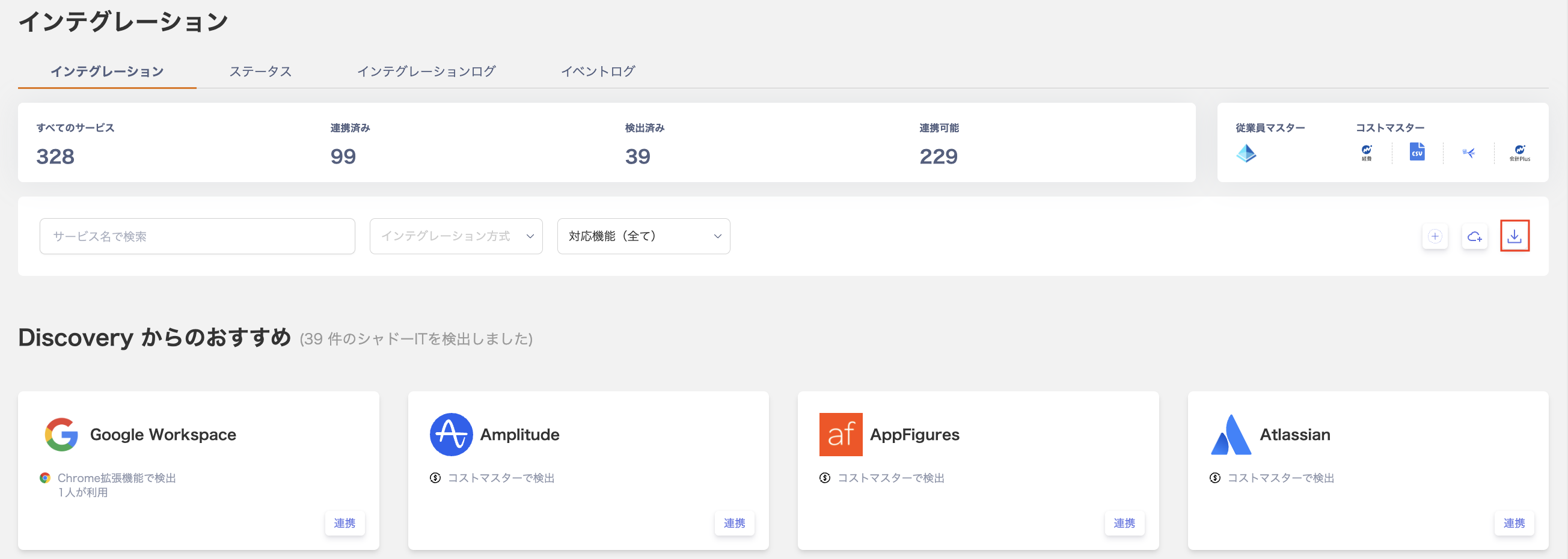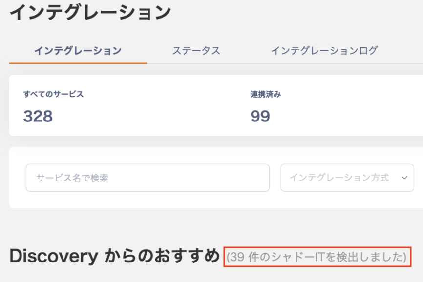 SaaS連携(ログインを利用した検出の場合)やブラウザ拡張機能を配布後、インテグレーション > インテグレーション > Discoveryからのおすすめに表示されます。