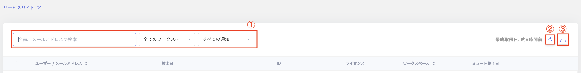 ①検索・絞り込み:「名前、メールアドレスで検索」、[全てのワークスペース][全ての通知]で絞り込めます。