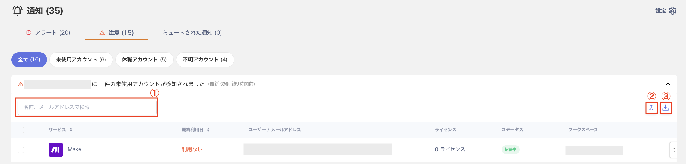 ③エクスポート:アカウント毎に通知に表示されるSaaSやアカウント情報をエクスポートできます。