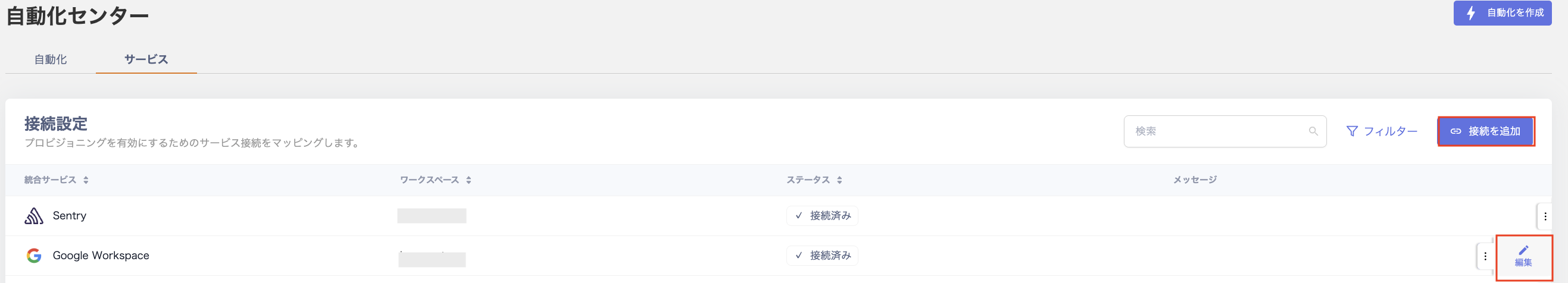 - 自動化 > 「サービス」タブ >「接続設定」画面 > [接続を追加]または各サービスの右端の三点リーダー[︙]から[編集]をクリックします。