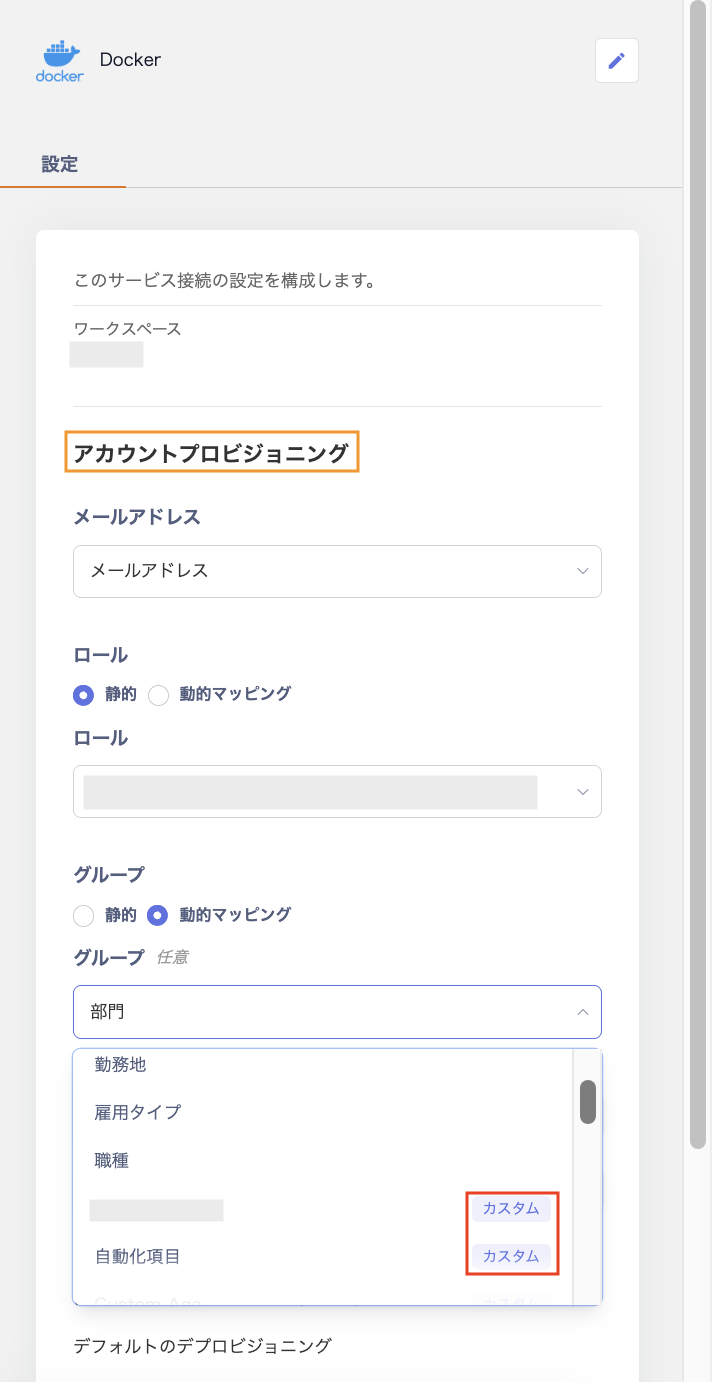 - 「設定」画面の「アカウントプロビジョニング」の各項目で「動的/静的マッピング」をラジオボタンで選択し、下に表示されるプルダウンメニューから、「カスタム」項目を選択します。