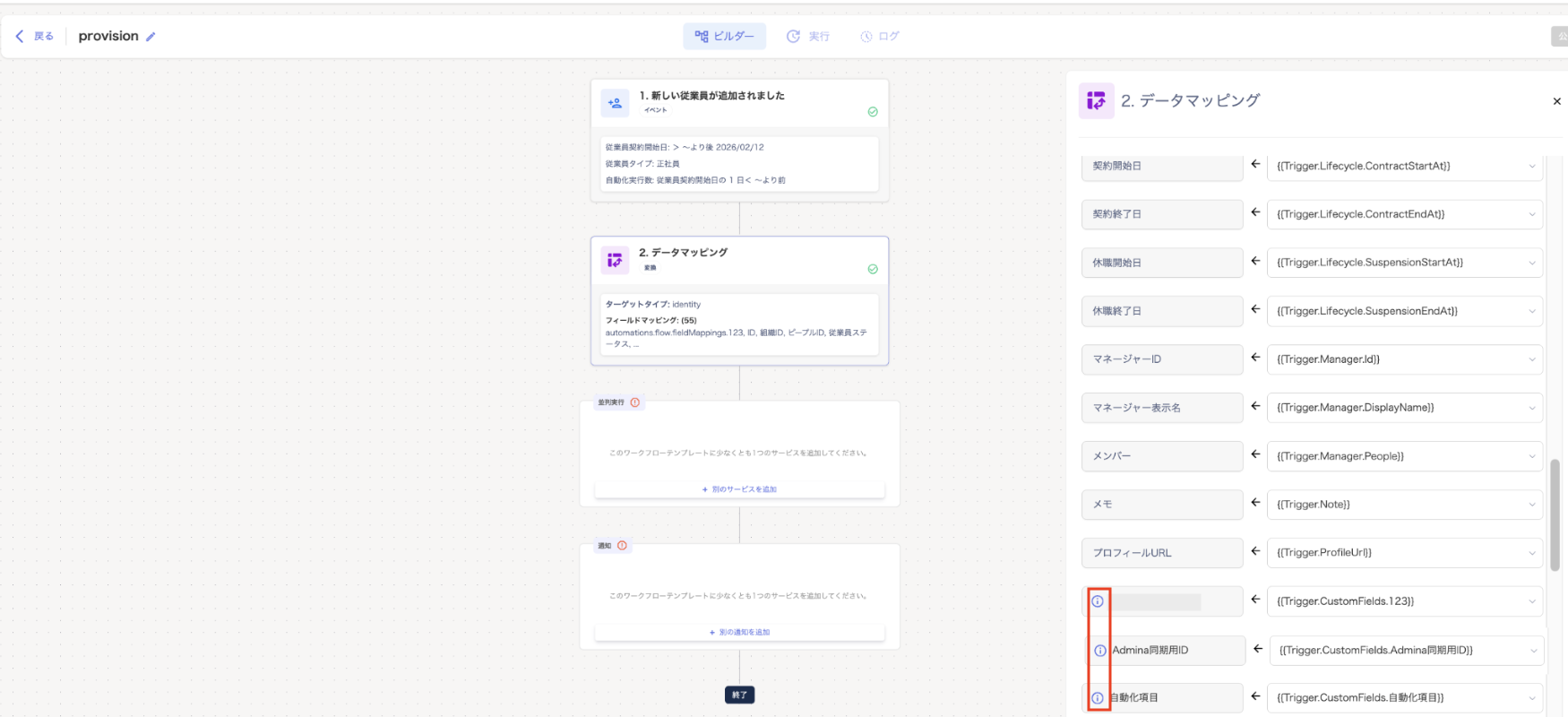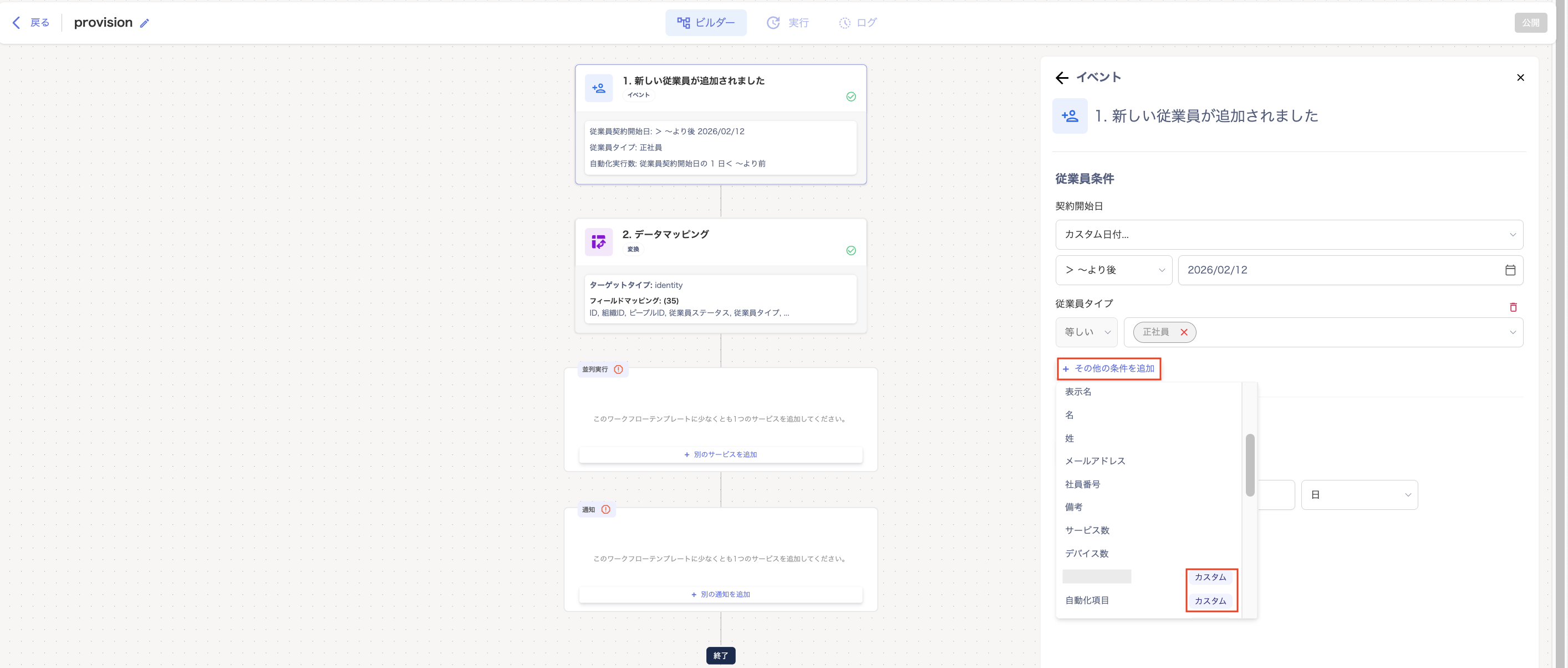 Adminaの自動化では標準項目だけではなく、ディレクトリ画面で作成した「カスタム項目」を、マッピングやワークフローのトリガー条件として設定できます。