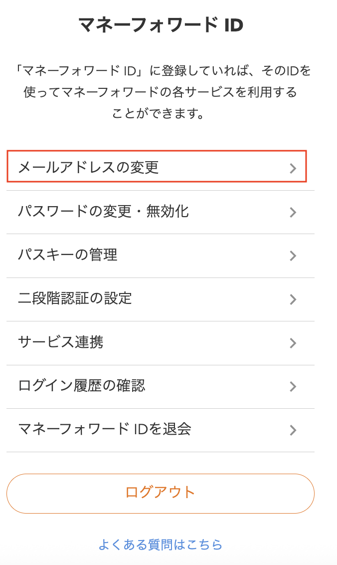 「マネーフォワードID」画面で[メールアドレスの変更]をクリックします。