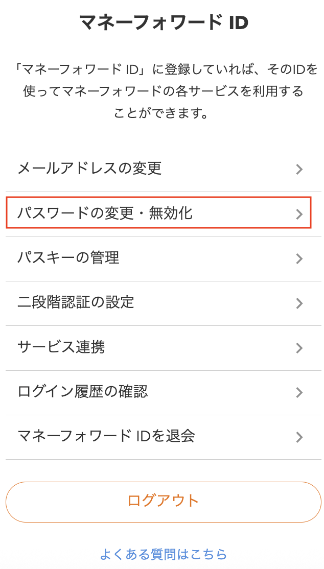 「マネーフォワードID」画面で[パスワードの変更・無効化]をクリックします。