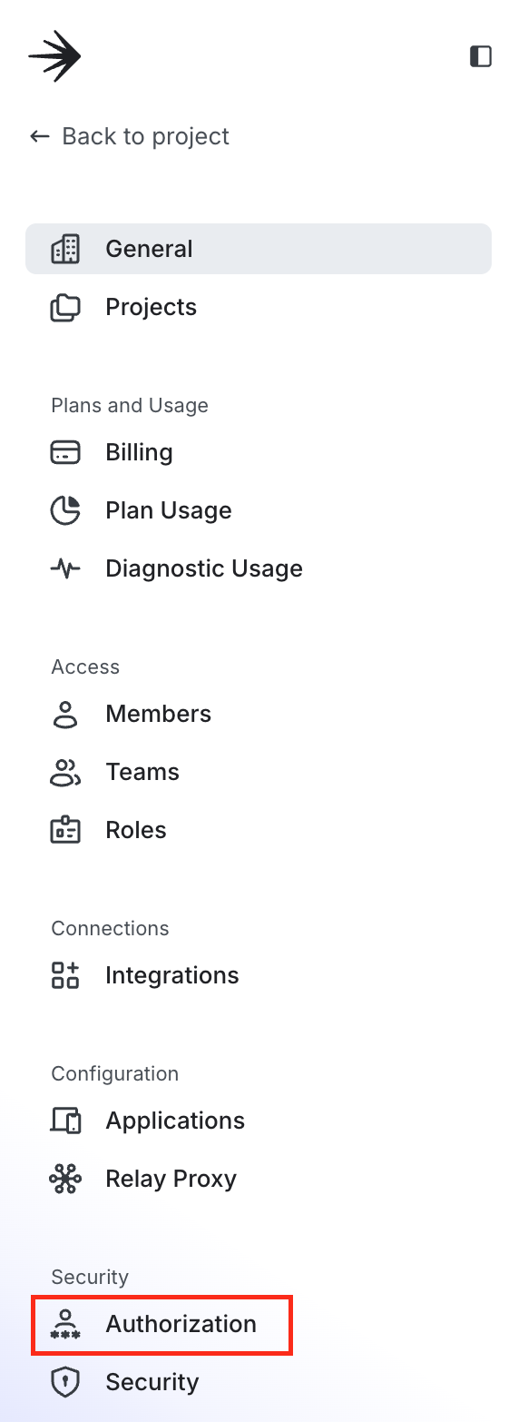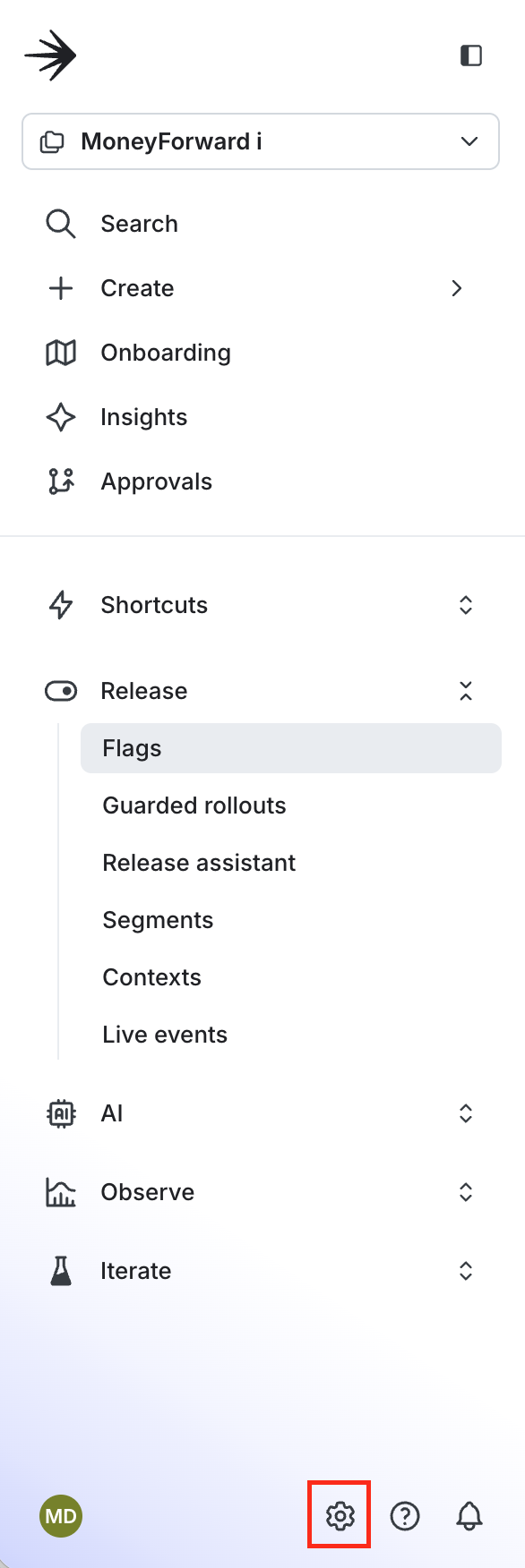 LaunchDarklyログイン後、左下の設定アイコンをクリックします。