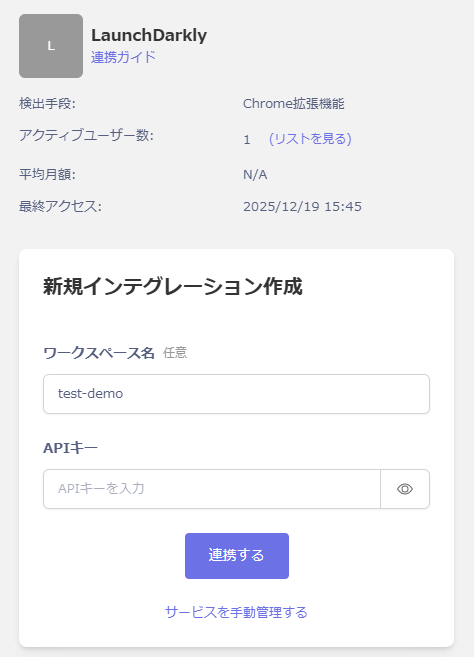 マネーフォワードAdminaのインテグレーション画面にて、LaunchDarklyで検索します。