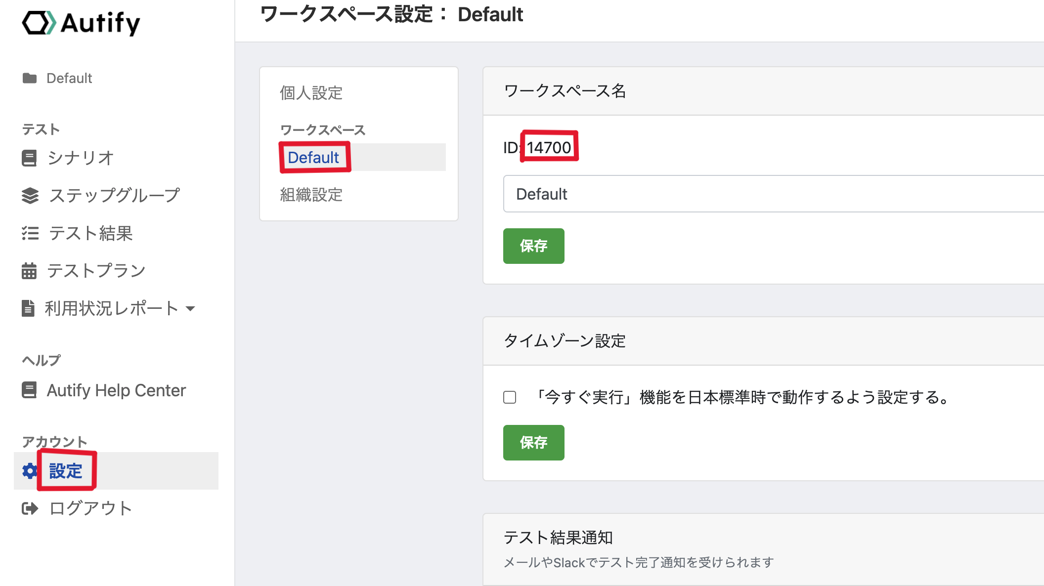 Autifyにログイン後、設定>ワークスペースと進みます。