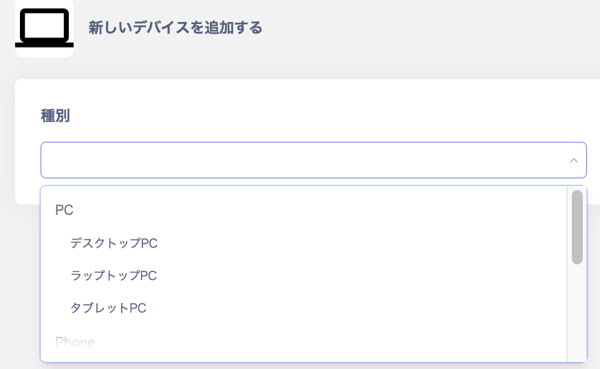 - 「新しいデバイスを追加する」画面で種別を選択します。種別は「PC(デスクトップPC/ラップトップPC/タブレットPC)、Phone(Phone)、Other(モニタ/サーバ/周辺機器/その他)」から選択します。