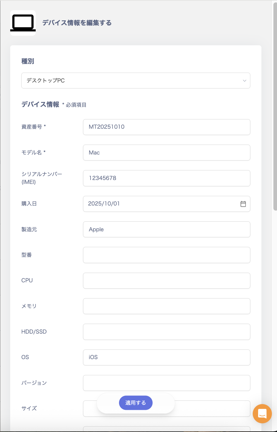 - 管理に必要なデバイス情報を入力し、[適用]をクリックします。入力項目はデバイス管理項目一覧、項目を追加する場合は独自の管理項目を追加するをご参照ください。