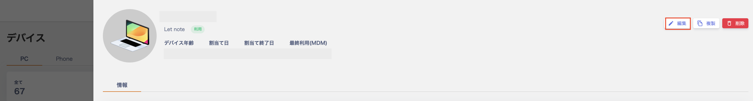 デバイスの使用者を割当て、デバイスのステータスを登録します。共有PCなどは「場所(ロケーション)」に割当て管理します。