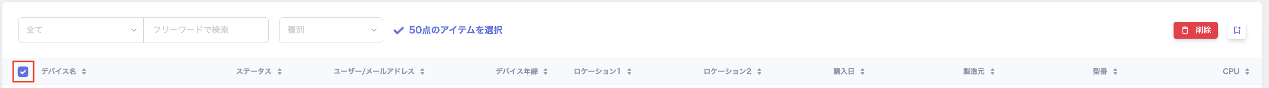 一括削除:デバイス画面左上のチェックボックスをチェックし、[削除]します。50件毎に削除できます。