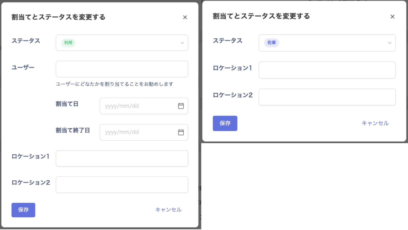 - 「割当てとステータスを変更する」画面で各項目を登録して[保存]します。ステータス「在庫/廃棄・解約」以外を選択した場合、「ユーザー/割当て日/割当て終了日」が表示されます。表示されない項目は項目を非表示にするをご参照ください。利用前のステータスの場合、ステータス「利用」を選択し、割当て日は未来日付を設定します。登録後にステータス「利用前」に変わり、割当て日に自動的にステータス「利用中」に変わります。ステータス:ステータス「利用/在庫/納品待ち/所在不明/故障/廃棄・解約」を登録します。