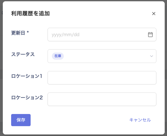 - 「利用履歴を追加」画面の各項目を入力し、[保存]します。ステータス「在庫/廃棄・解約」以外を選択した場合、「ユーザー/割当て日/割当て終了日」が表示されます。