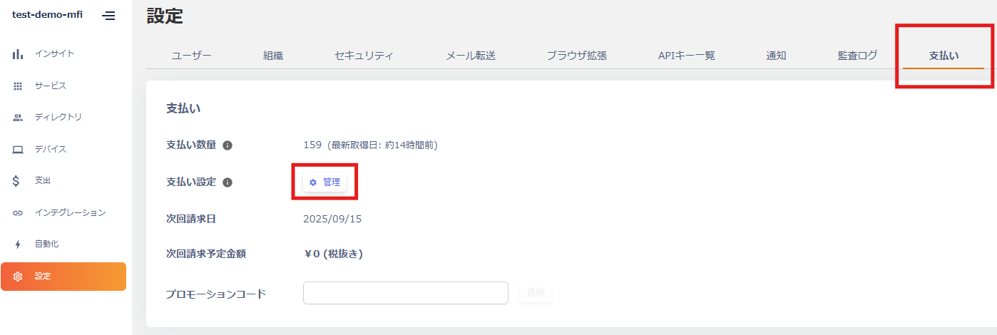 - 設定 > 支払い > 支払い設定 > [管理]をクリックします。