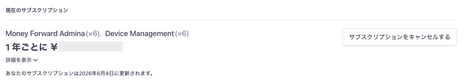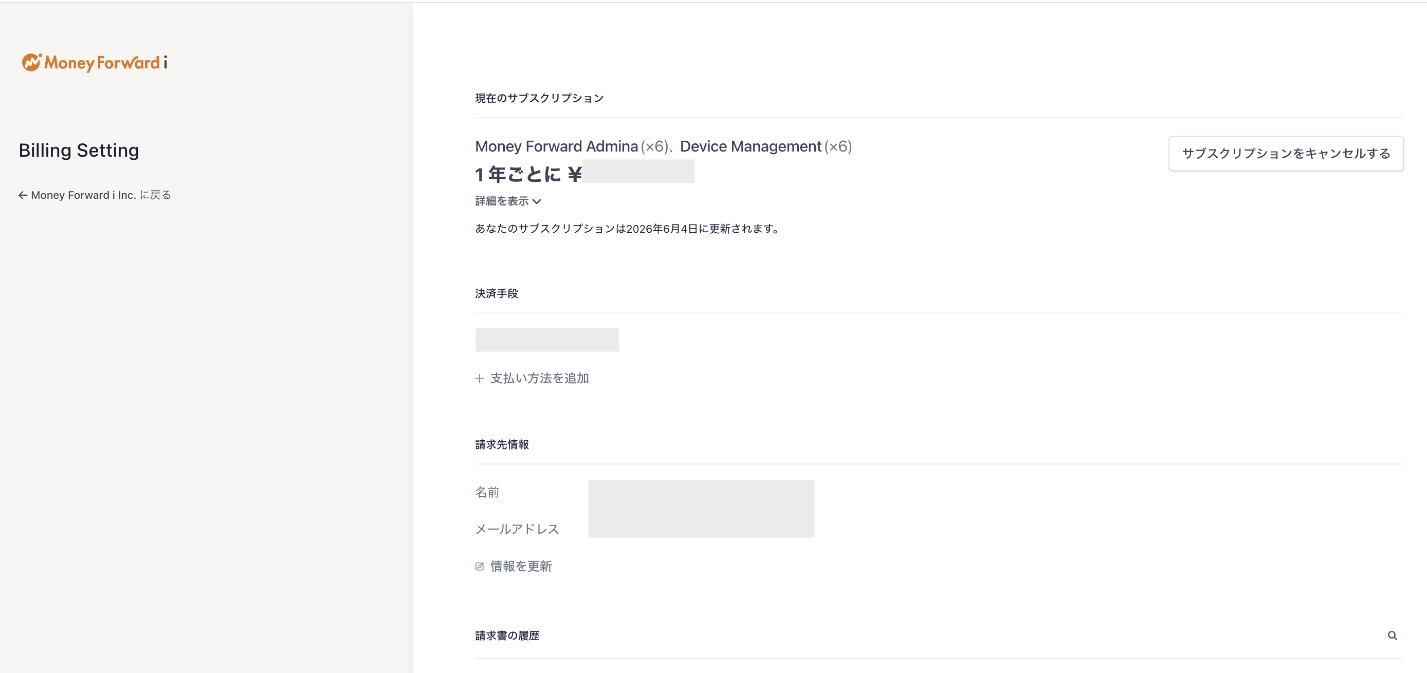 - 管理画面では「現在のサブスクリプション、決済手段、請求先情報、請求書の履歴」を確認できます。