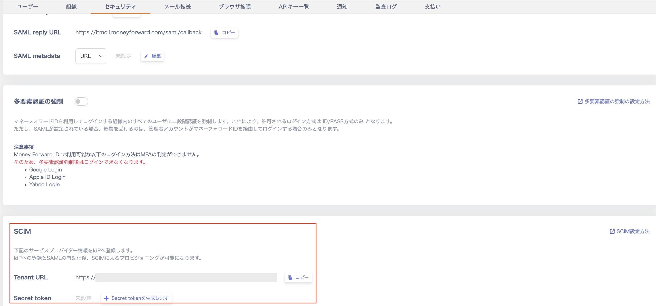 設定 > セキュリティでIdPの設定画面に必要とするtenant URLとsecret tokenを取得できます。Secret tokenがない場合は生成ボタンを押してください。