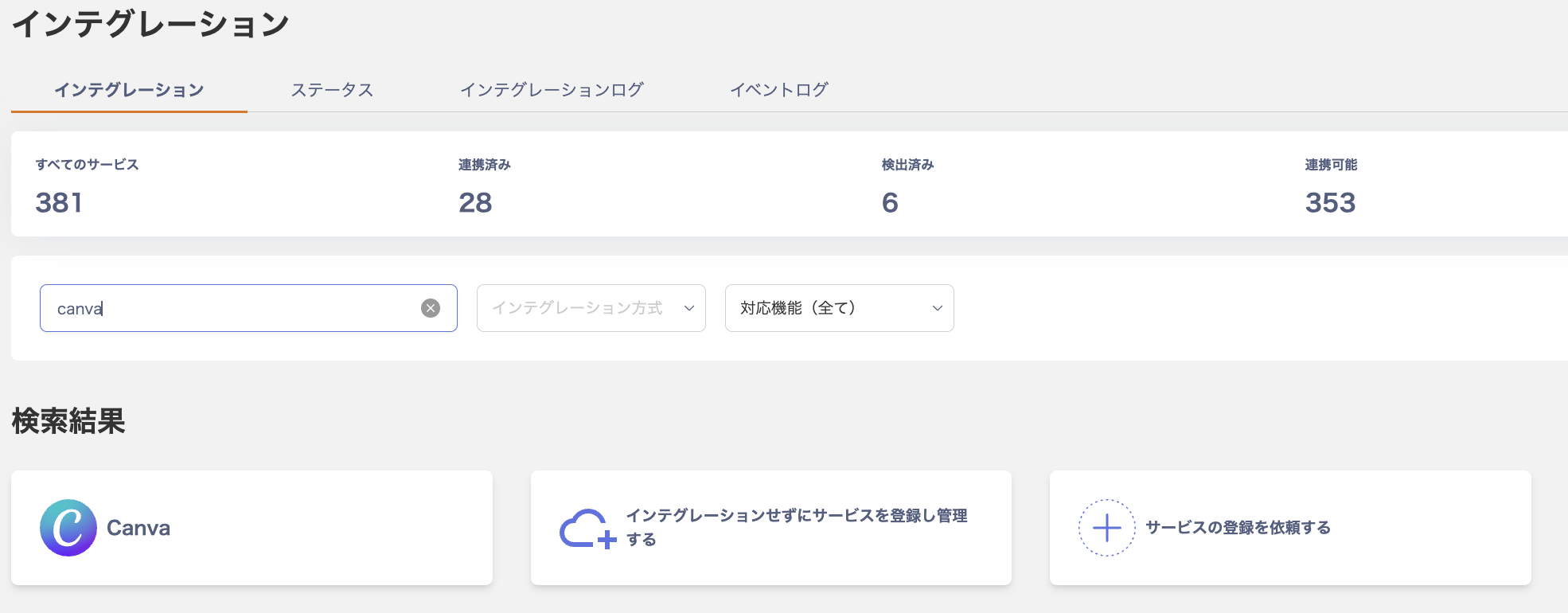 - Adminaのインテグレーション画面にて、Canvaを検索します。