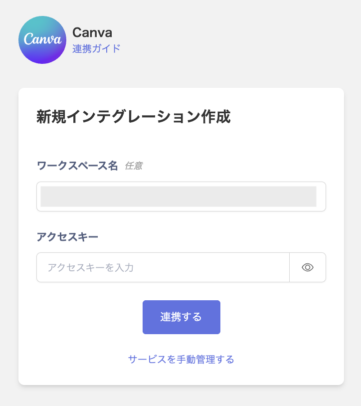 - 管理者権限を持つメールアドレス・パスワード、前の手順で取得したワークスペースキーを入力し、連携するをクリックします。