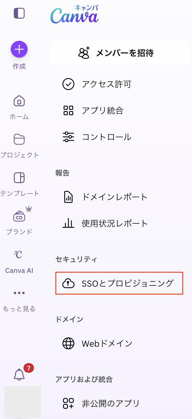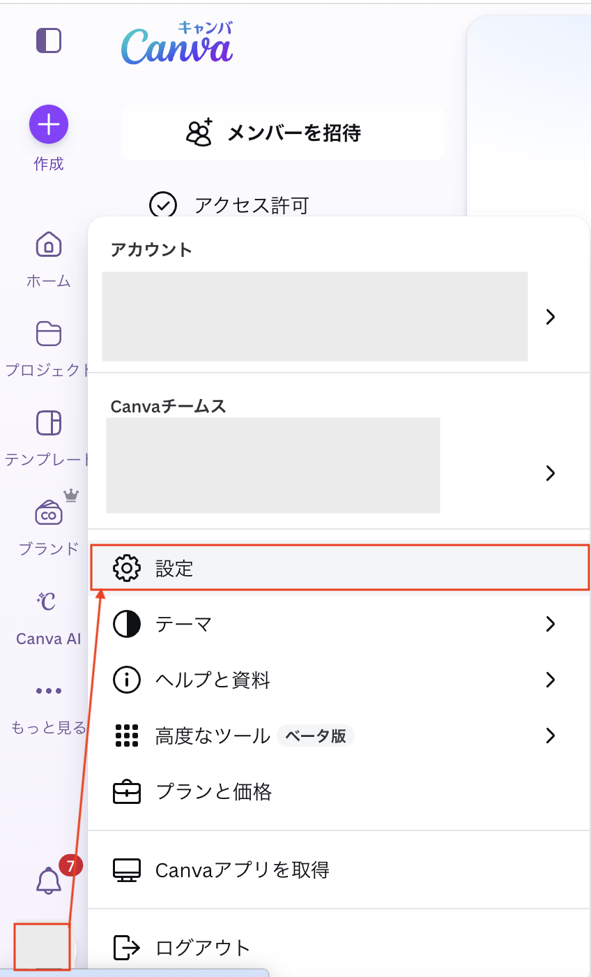 - Canvaにログインし、左下のアカウント >[設定]をクリックします。