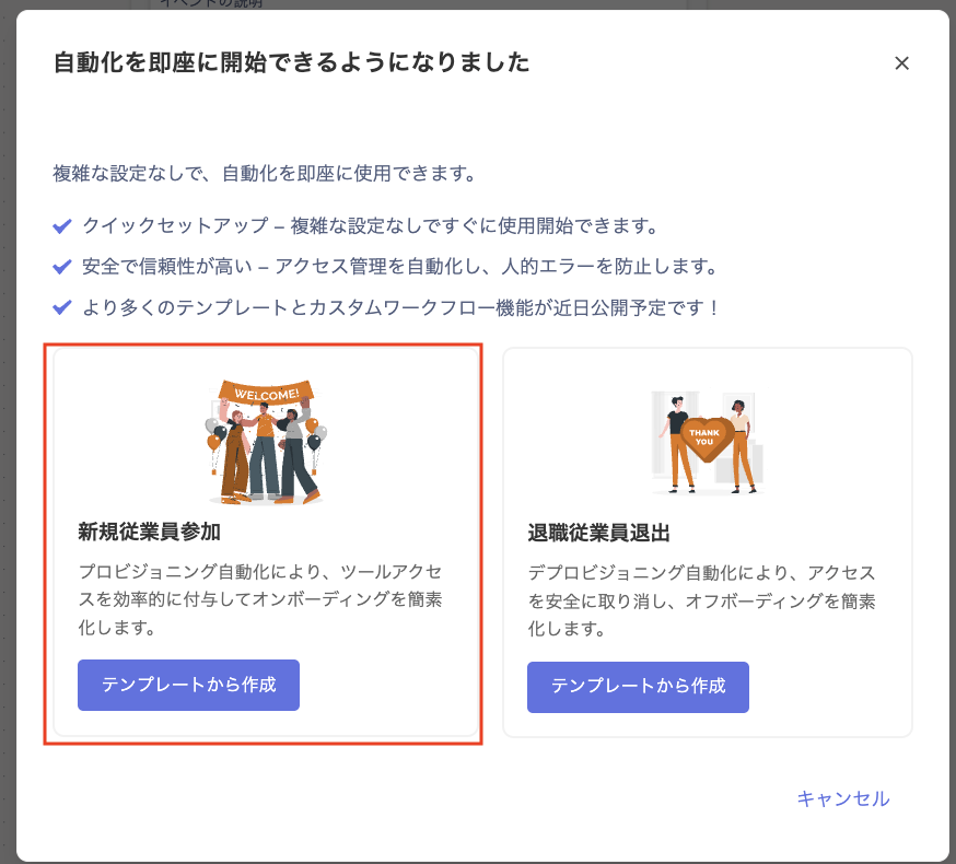 - 自動化 > [自動化を作成] > 「新規従業員参加」画面の[テンプレートを作成]をクリックします。
