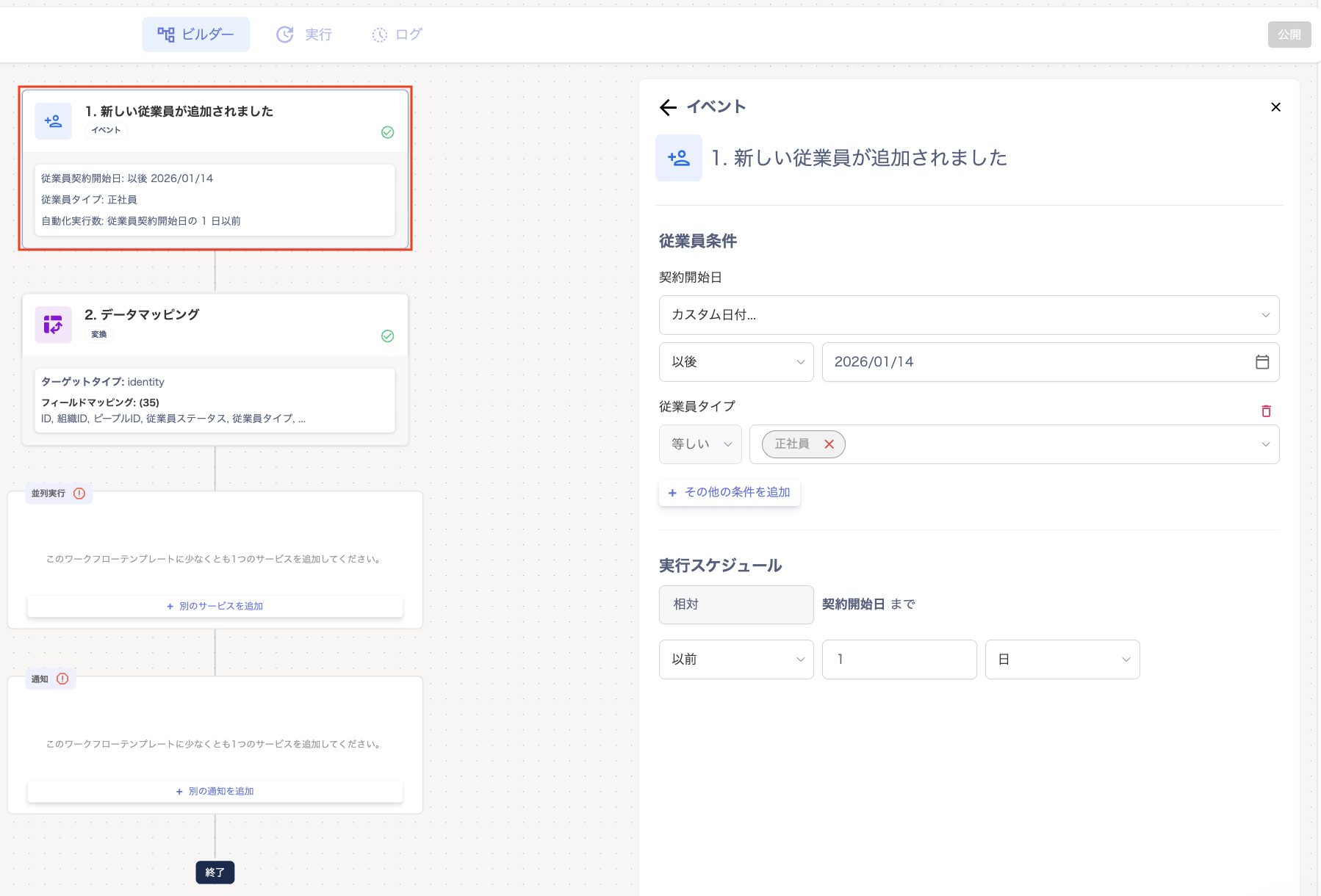 - ワークフロー実行の条件(契約開始日、従業員タイプ)と実行スケジュールを設定します。