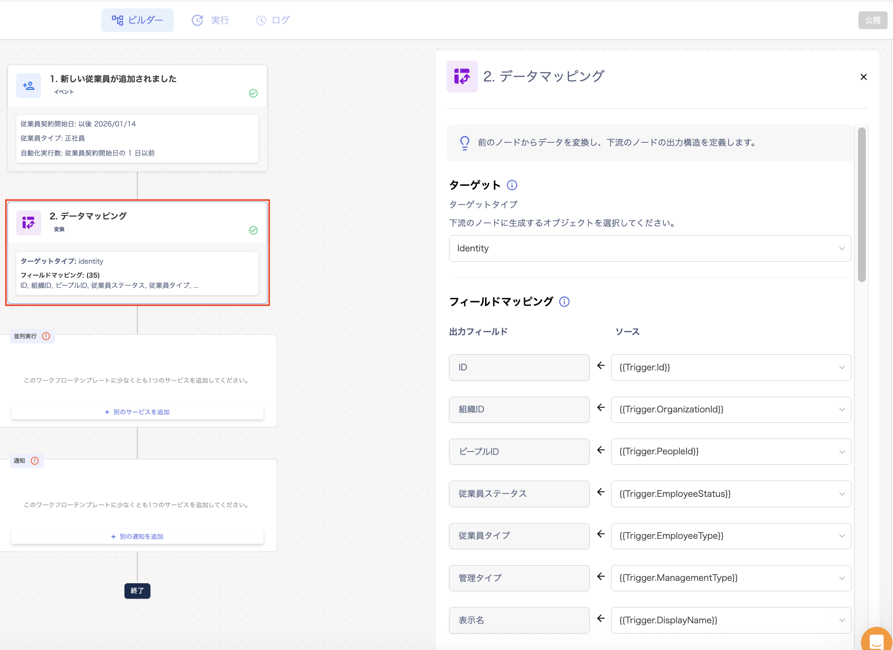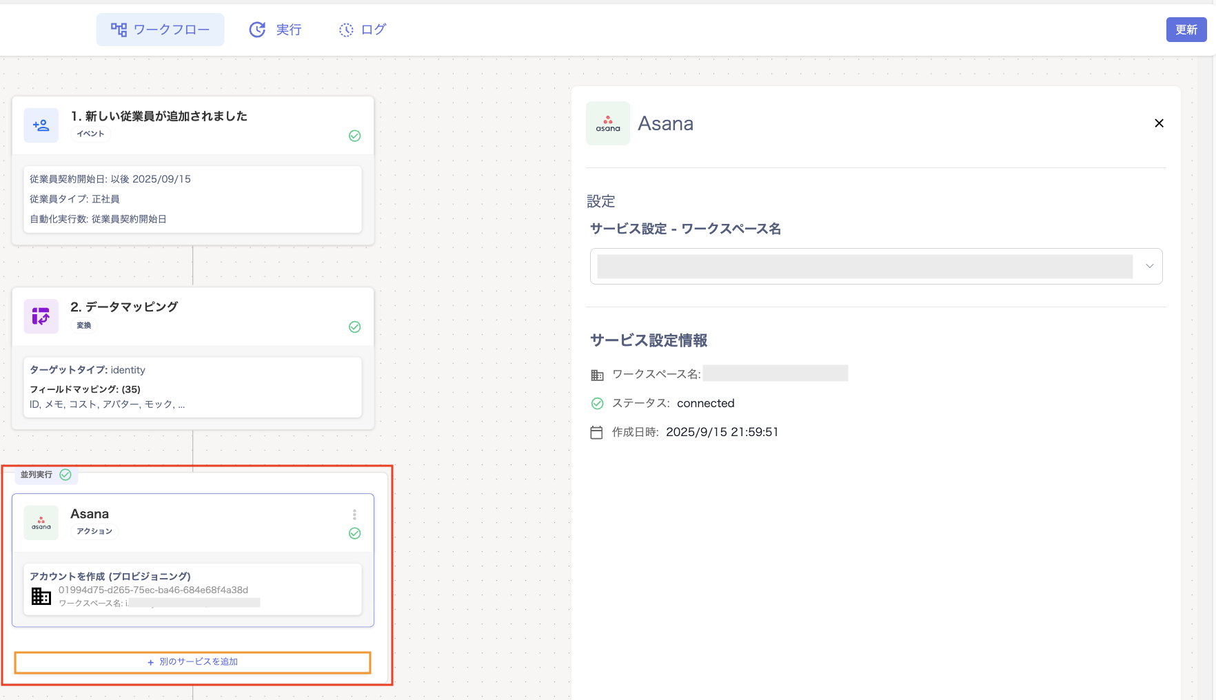 フィールドマッピング:データソースからターゲットフィールドへの変換ルールを定義します。 - 「並列実行」をクリックして、ワークフローに設定するサービスを追加します。