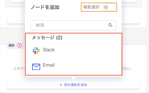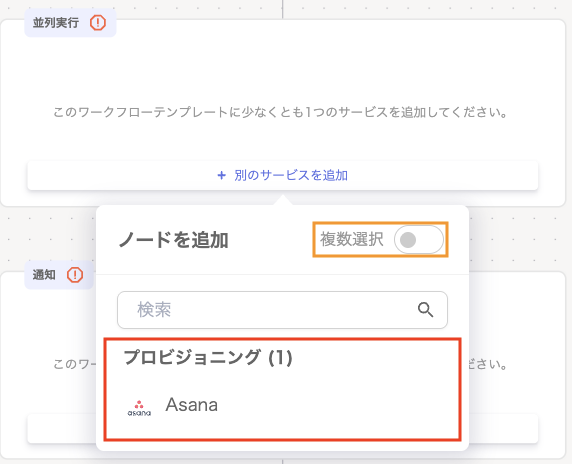 複数のサービスをワークフローに設定する場合、「複数選択」をONにします。