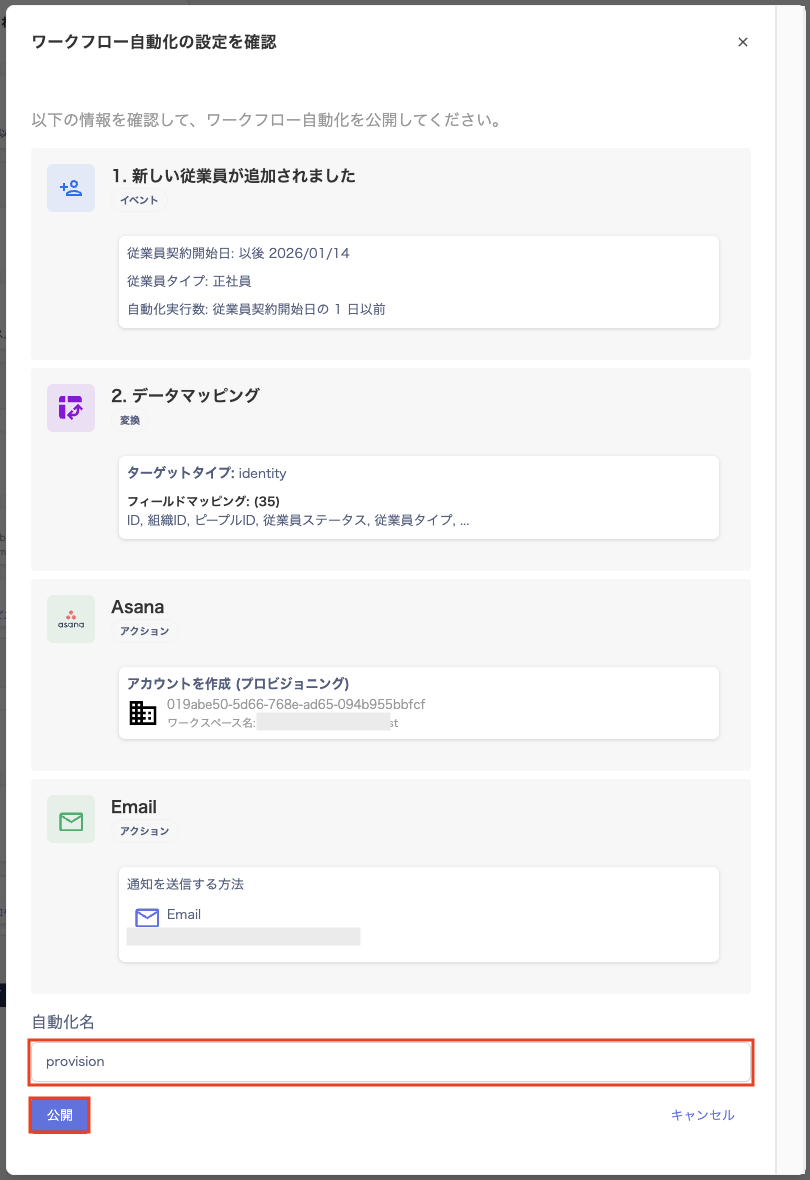 - 「ワークフロー自動化の設定を確認」画面が表示されますので、自動化名を入力して、[公開]をクリックします。