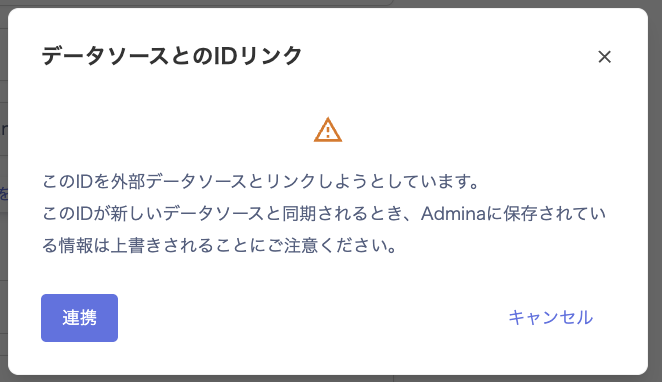 - 「データソースとのIDリンク」画面が表示されますので、記載内容をご確認の上、[連携]をクリックします。