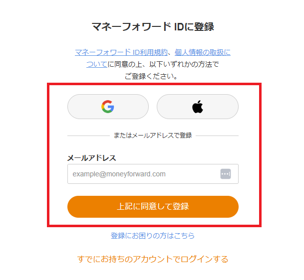 - マネーフォワードIDを既にお持ちであれば下側の「すでにお持ちのアカウントでログインする」ボタンからログインしてください。