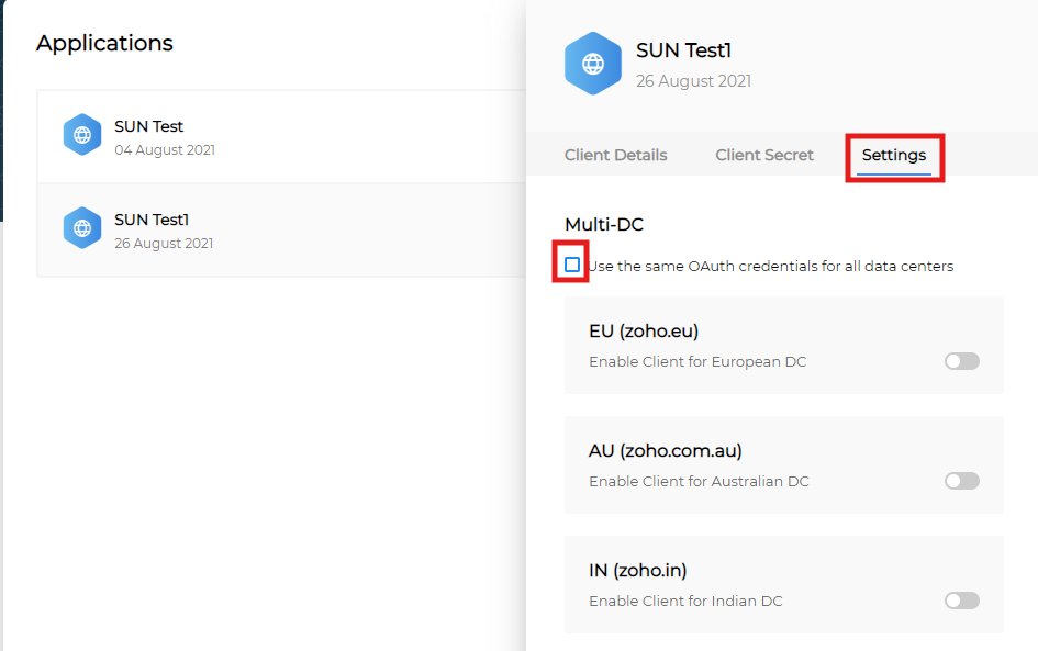 Settings > Use the same Oauth credentials for all data centers にチェックを入れます。